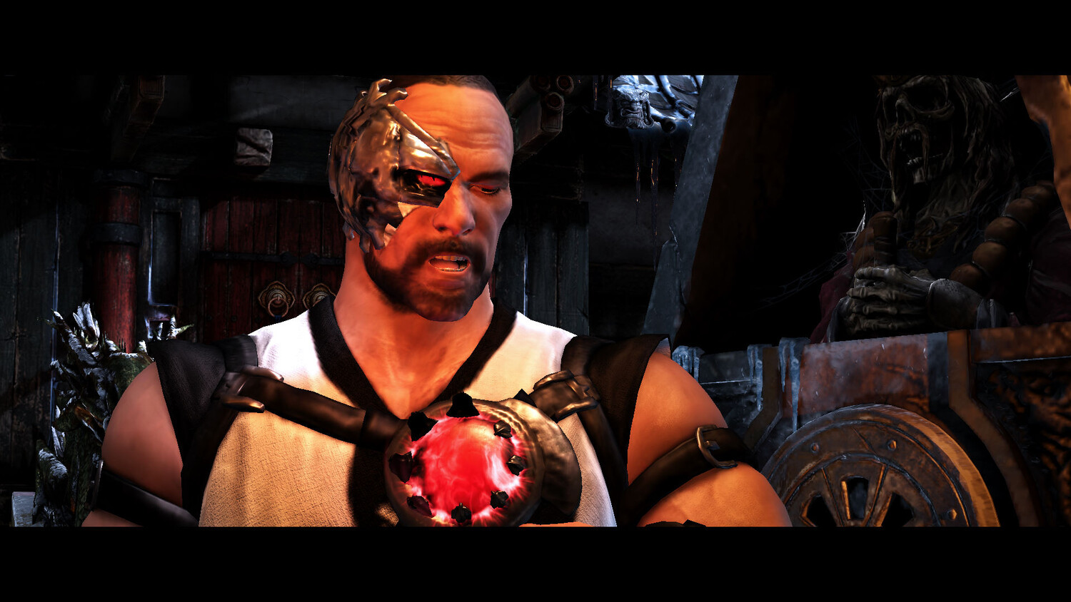 Ключевые визуальные особенности Традиционная монашеская ряса: - длинный халат из грубого льна или хлопка в приглушённых тонах (бежевый, охристый, тёмно‑серый); - широкие рукава, завязанные на запястьях, чтобы не мешать движениям; - пояс из плетёной ткани, подчёркивающий аскетичный стиль. Минималистичная экипировка: - отсутствие характерного кибернетического глаза — лицо полностью человеческое, с суровым выражением; - короткие волосы, аккуратно собранные в низкий хвост (в отличие от растрёпанного образа Кано в каноне); - на руках — простые кожаные наручи без металлических вставок. Символика Шаолиня: - вышитый на груди круг с иероглифом (например, 禅 — «дзен» или 武 — «воинское искусство»); - подвески из деревянных бусин на поясе, напоминающие мала. Оружие: - вместо ножей и гранат — деревянный посох, выполненный в стиле шаолиньского оружия; - в некоторых анимациях посох может разделяться на две части (нунчаки), что отсылает к боевым техникам монастыря. Текстуры и материалы: - ткань выглядит изношенной, с пятнами пота и следами тренировок; - деревянные элементы оружия имеют натуральную текстуру с видимыми узорами древесины.